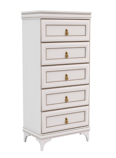Комод Агата АТ-9, в котором угадываются мотивы средиземноморского стиля и очарование классических линий, займет достойное место в современных интерьерах и станет незаменимым элементом для обустройства уютной комнаты. Высокий комод имеет пять выдвижных ящика.Шариковые направляющие полного и бесшумного выдвижения на ящиках. Корпус - ЛДСП, фасад - МДФ. Двойная система объемных карнизов.Петли на фасадах с системой плавного закрывания (доводчики).