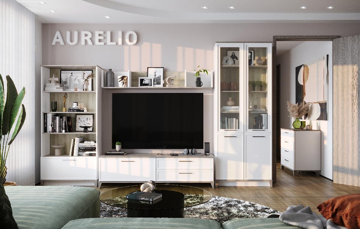 Дизайн коллекции Aurelio лаконичен и элегантен: теплота базового древесного оттенка Блэквуд сатиновый дополнена изысканностью белоснежных фасадов в светлом варианте гостиной и глубоким контрастным благородным Антрацитом в темном. Модули коллекции Aurelio легко комбинировать между собой, создавая неповторимые интерьеры. Коллекция Aurelio гибкая и многогранная, что дает возможность покупателю воплотить в реальность его  мечты об идеальном доме и создать нужное настроение в гостиной. Для кого-то это будут сдержанные интерьеры в стиле современная классика, для лю-дей среднего возраста A
