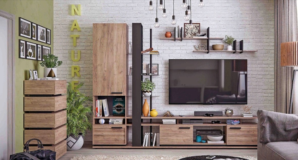 Брутальная коллекция Nature отвечает всем требованиям творческих, молодых и динамичных людей, которые ценят свободу и пространство. Выполненные в современном стиле модули практичны, функциональны, обладают "характером" и стилем.В переводе с английского NATURE означает природа, характер, сущность, что отлично характеризуют нашу коллекцию. Функциональная и красивая NATURE наполнена любовью к натуральным материалам и природной цветовой гамме. А подобранные для коллекции декоры: темный - Дуб Табачный и светлый - Гаскон Пайн, с текстурой натуральной древесины, смотрится эффектно и уместно в любом интерьере.Удачная комбинация мягкого древесного и динамичного чёрного цвета задает ритм всей коллекции NATURE, являя собой классическое сочетание современного лофта. Кроме того, такой декор преобразит внешний вид комнаты, а мебель будет легко сочетается с другими предметами. Использование стеклополок в стеллаже и тумбах под ТВ визуально облегчает конструкцию. Прочное тонированное стекло толщиной 4 мм способно выдержать нагрузку в 5 кг, что позволит легко разместить любимые книги, диски, комнатные растения или предметы декора. Для гостиной в декоре Дуб Табачный подобрано тонированное стекло в цвете бронза, а для светлой гостиной в исполнении Гаскон Пайн - серое.Особый характер коллекции помогут придать разноуровневые фасады. Накладки из ЛДСП оживят фасад, создавая дополнительный акцент брутального антуража комнаты. Лаконичные мягкие формы, элегантные ручки и невидимые глазу опоры органично дополнят природную красоту коллекции. Регулируемые опоры помогут скрыть небольшие неровности пола, а также компенсировать массивность изделий, сделав мебель более легкой и «воздушной». А элегантные ручки из массива дерева добавят мебели роскоши и «характера».