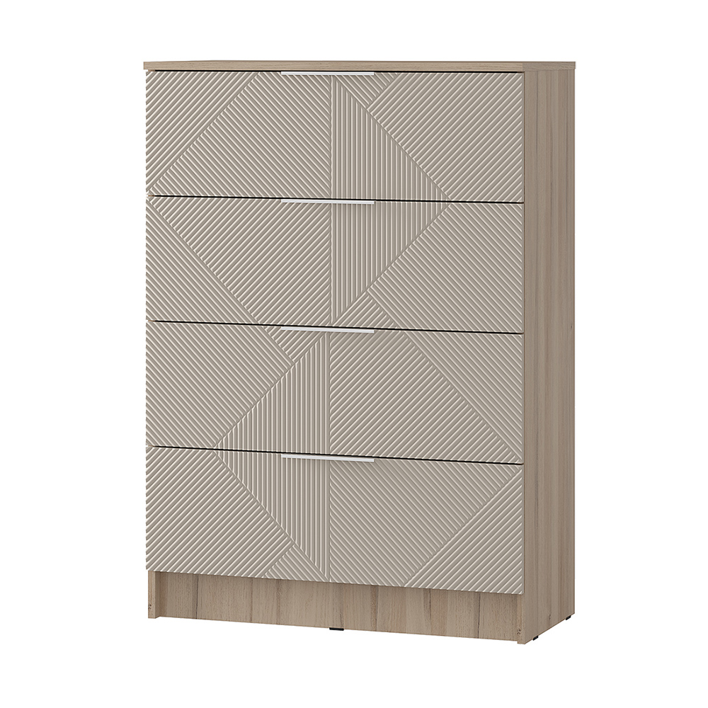 Компактный комод Эмилия с выдвижными ящиками. Лаконичные модели из данной серии украшены изысканной фрезеровкой, а приглушенная цветовая гамма легко впишется в современный интерьер. Разнообразие модулей позволит подобрать идеальный комплект для вашей гостиной или спальни.Особенности:эффектные торцевые ручки-язычкифрезеровка на фасадах МДФнаправляющие ящиков шариковыемаксимальная нагрузка на крышку 10 кгмаксимальная нагрузка на ящик 5 кг
