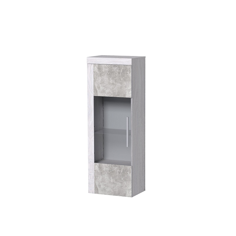 Если вы считаете, что хранить в гостиной посуду уже не модно, шкаф со стеклянной дверцей и стеклянными полками станет отличной витриной для дорогих и любимых фотографий и памятных вещиц. Стеклополки в обработке еврокромкой выдерживают до 10 кг каждая. Их можно декоративно подсветить с помощью светодиодной Berlin 5 Подсветка (в комплекте не поставляется, приобретается отдельно). Фасад перенавешивается на левую и правую сторону. Серебристая стильная ручка из массива дерева и серое тонирование стекло фасада вносят смелые дизайнерские штрихи в восприятии актуальноого декора "под бетон".