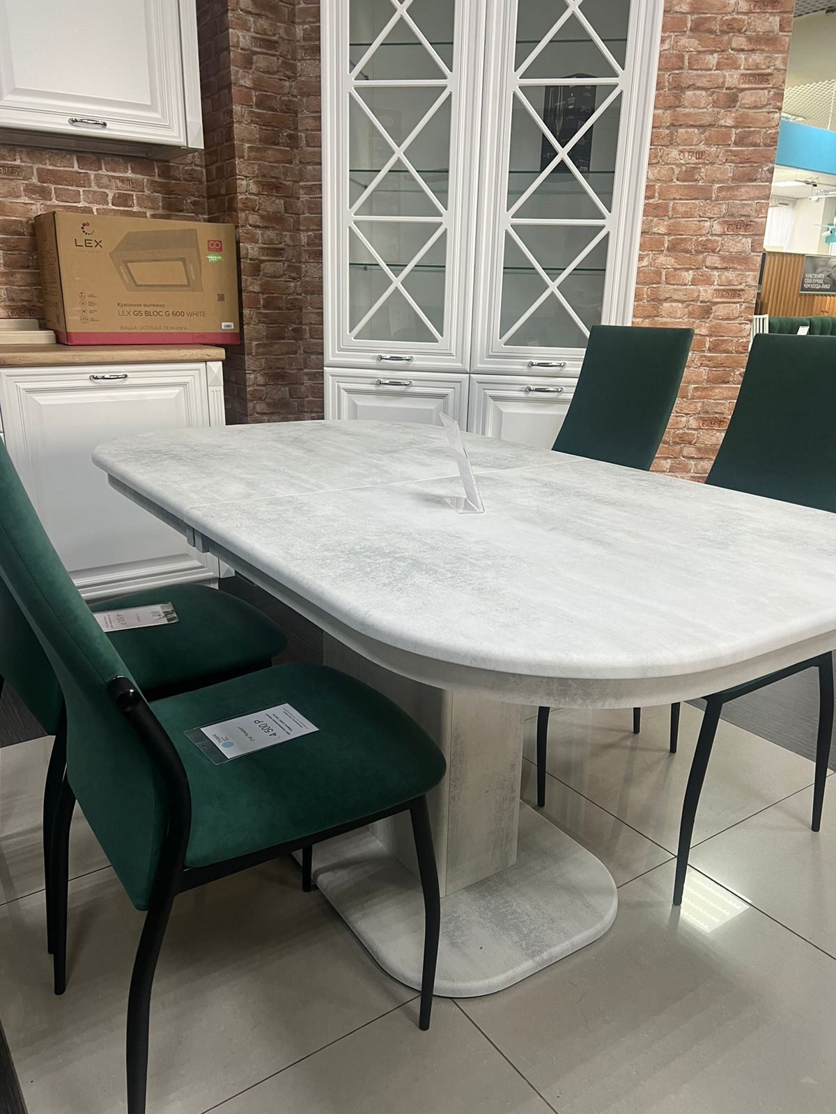 Столешница в овальной форме с декоративной юбочкой на центральной опоре. Механизм с 2-мявставками,альтернативного использования(возможность раскладки на 1 или 2 вставки).-Завальцованные края без стыков и кромки.-Износостойкий материал (влаго и термостойкий до 80 градусов)- 2 вставки- широкий спектр оттенков и фактур- устойчивая конструкция-надежный механизм